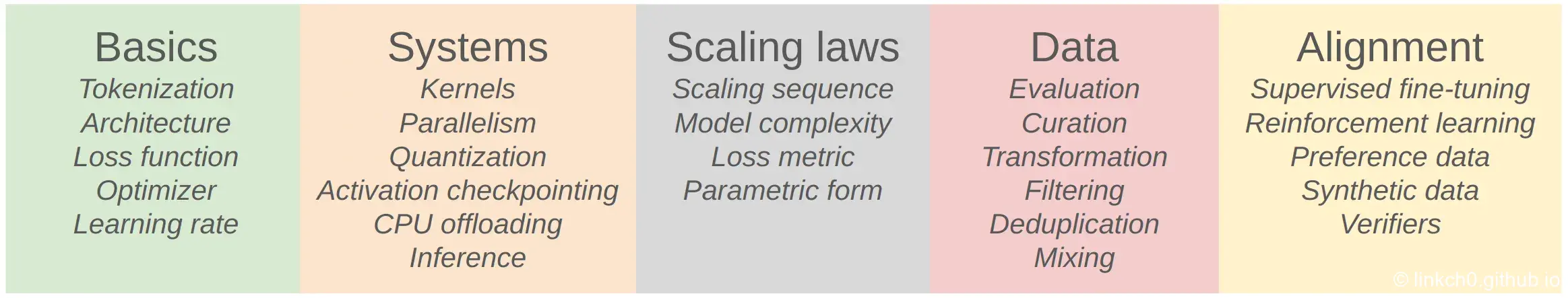 Updating Lectures¶ Lecture 1 Overview, tokenization¶ Basics¶ Systems¶ Scaling Laws¶ Data¶ Alignment¶ Comments