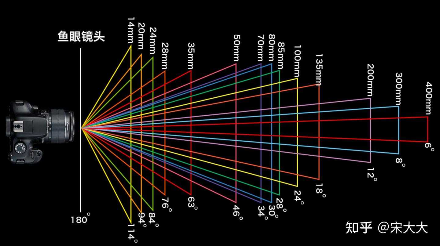 镜头的焦距越小,拍摄画面的视角越宽广,能取景到的物体就越多;