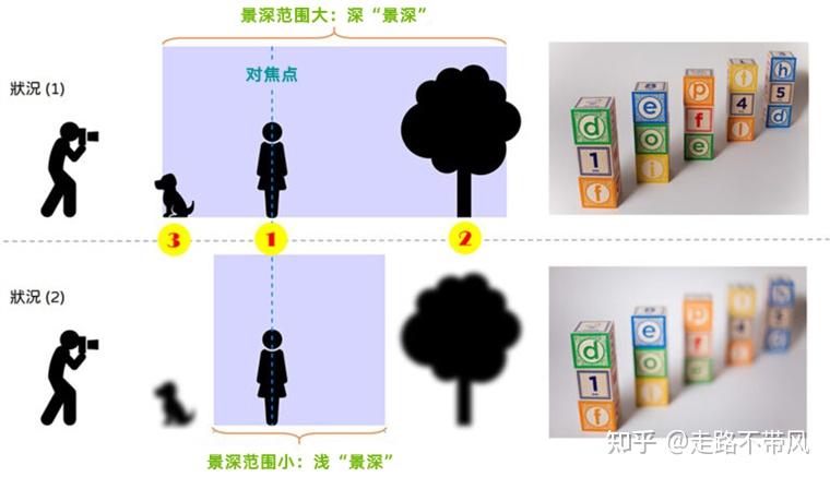 光圈(孔径)越大 (f/值越小) → 画面清晰范围越窄 → 景深越浅(聚焦于某个点)
